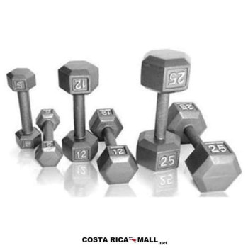 Mancuerna hexagonal de hierro sólido sin recubrimiento. Envíos a toda Costa Rica. Disponible en varios pesos, ideal para fuerza y tonificación muscular. Precio por unidad.