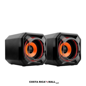 Parlantes estéreo multimedia Argom ARG-SP-1049BK con tecnología de sonido 2.0 canales, potencia de 5W y diseño compacto.
